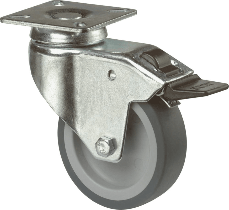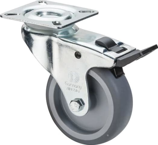 Lenkrolle mit Totalfeststeller • Gabel aus Stahlblech, verzinkt-chromatiert • Zweireihiger Kugelkranz im Gabelkopf • Lauffläche: thermoplastisches Gummi, blaugrau • Radkörper: Kunststoff • Gleitlager