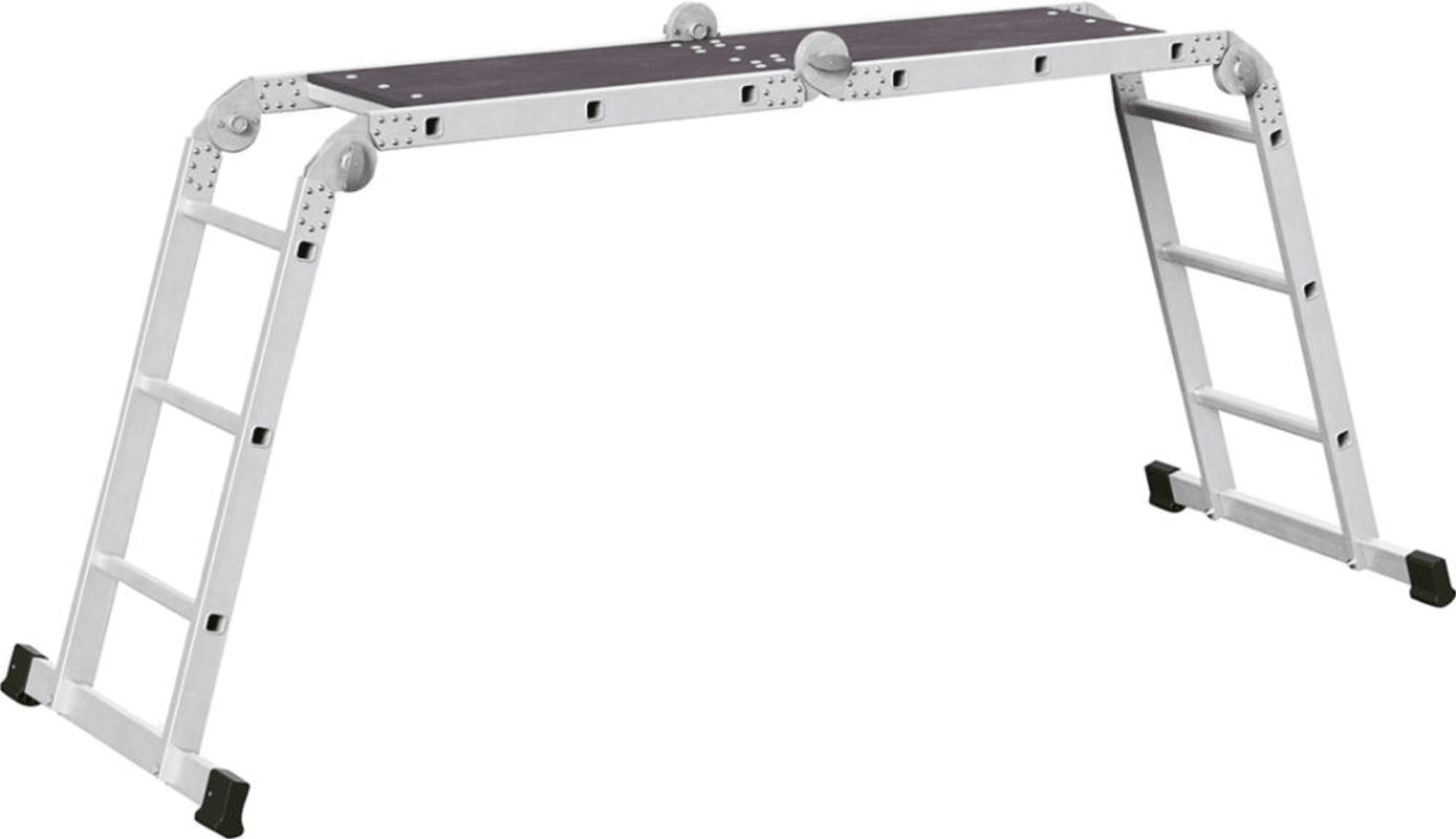 ZARGES Multimax M: Vielfältig einsetzbare Leiter mit bis zu vier Funktionen, die sich für den Transport ganz klein macht. -Einfach zu bedienendes, automatisch einrastendes Sicherheits-Aluminium-Lamellengelenk. -Bestell-Nr. 41610 und 41611 mit klappbarer Plattform aus Holz für den Einsatz als Arbeitpodest. -Leiterbreite: 420 mm. -Zum Transport kompakt und platzsparend zusammenlegbar. -Sprossen-Holm-Verbindung durch hochfeste ZARGES Qualitätsbördelung. -Extrabreite Quertraverse.