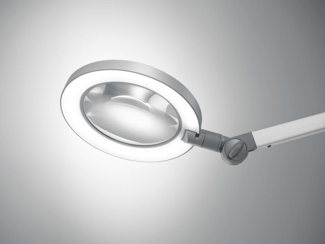 Lupenleuchte MLD • Leuchtmittel: LED-Technologie • Dimmbar • Verzerrungsfreies Sehen und ergonomisches Arbeiten • Gehäusematerial: Aluminium, farblos eloxiert, und Kunststoff • Blende: aus Kunststoff