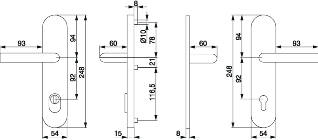 Meesenburg Artikelbezeichnung: MACO DRÜCKERGARNITUR MIT KS BREITSCHILD VK10MM E=92 64-83MM EDELSTAHL, 477439