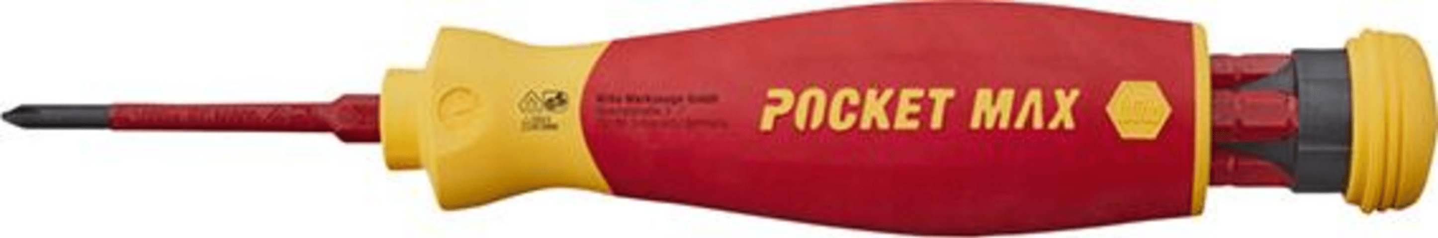 VDE-Magazin-Bithalter PocketMax® electri • Brünier • Chrom-Vanadium-Stah • Öffnen und Schließen durch magnetische Schließfunktio • slimTECHNOLOGY: schlankere Klingen durch integrierte Schutzisolatio • Mehrkomponenten-Grif • Isoliert bis 1000 V AC und 1500 V DC nach IEC 60900:201 Inhalt 1 Bithalter PocketMax® electri 1 Wechselklinge für Schlitz-Schrauben 3,5 mm 2 Wechselklingen für Kreuzschlitz-Schrauben PH 1; PH 1 Wechselklinge für PlusMinus-Schrauben PZ/S 2