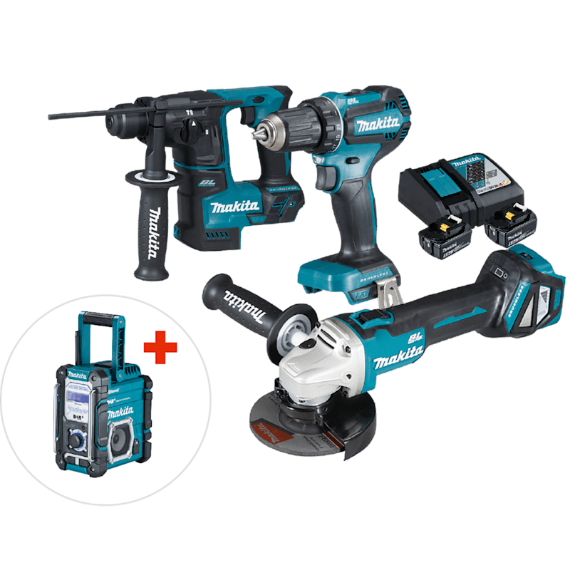 MAKITA 18V Helden Starter-Set – Das Komplettpaket für Profis und Heimwerker. Enthalten sind der Akku-Bohrschrauber DDF485RTJ mit bürstenlosem Motor, 2-Gang-Vollmetallgetriebe, 21 Drehmomenteinstellungen und LED-Doppellicht für präzises Arbeiten. Der Akku-Winkelschleifer DGA511Z bietet 3.000–8.500 min⁻¹, 125 mm Scheibendurchmesser, Wiederanlaufschutz und AVT-Antivibrationsgriff. Mit dem Akku-Bohrhammer DHR171Z (1,2 J Schlagstärke, SDS-Plus) bohrst du bis 17 mm in Beton – vibrationsarm, mit LED und Konstantelektronik. Für Unterhaltung sorgt der MEESENBURG DEAL mit dem Baustellenradio DMR112 mit DAB/DAB+, FM, Bluetooth, AUX & USB, robustem Gehäuse und IP64-Schutz. Alle Geräte sind Teil des MAKITA LXT 18V Systems und bieten maximale Flexibilität, Leistung und Langlebigkeit – ideal für die Baustelle, Werkstatt oder den ambitionierten Heimwerker.
