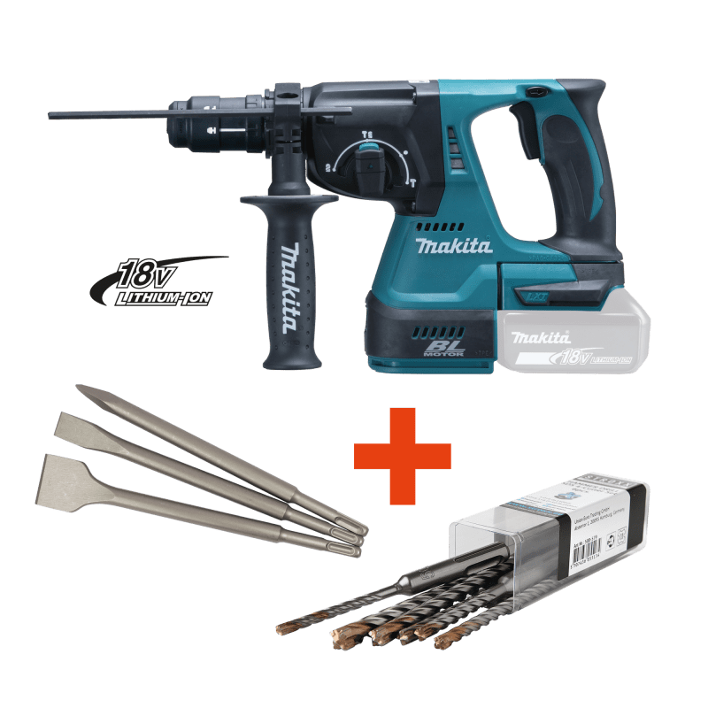 Makita Akku-Bohrhammer-Set, bestehend aus:Akku-Kombihammer DHR243Z SoloSTROXX SDS-Plus Hammerbohrer-Set 4-Cut, 6-teilig 500-579STROXX Meißel-Set, SDS Plus, 3-teilig 100-999