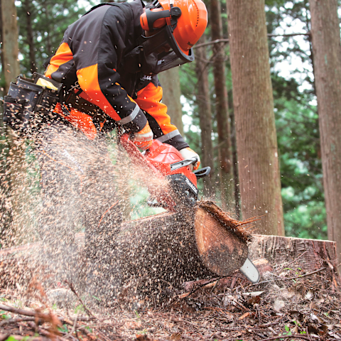 Die leistungsstarke Akku-Kettensäge in Signalfarbe Rot ist besonders für schwere Anwendungen wie das Fällen, Ablängen und Entasten großer Holzstücke ausgelegt und liefert mit dem BL4080H maximale Leistung – vergleichbar mit einer 50 cm³ Benzin-Kettensäge.