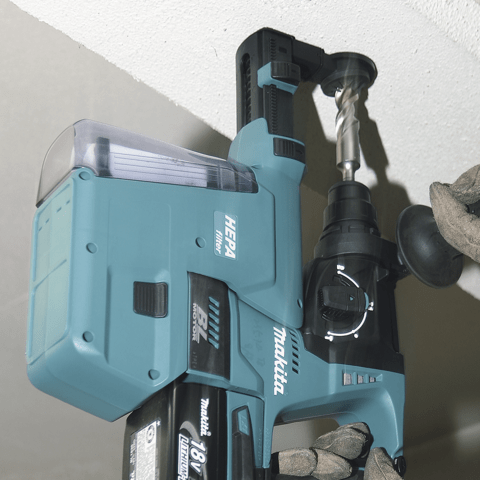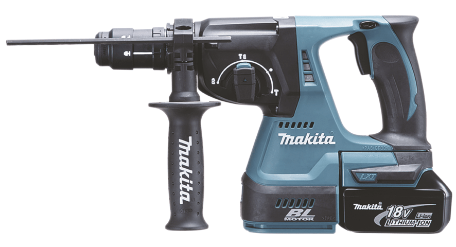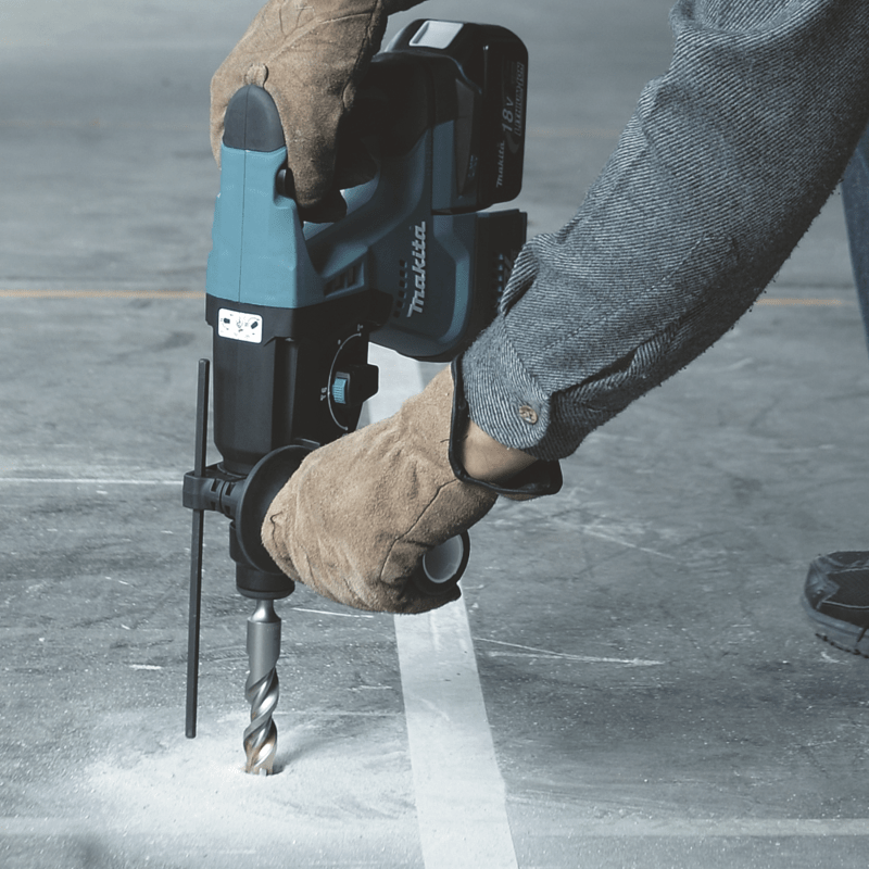 Akku-Kombihammer, Seitengriff 36, Schnellwechselfutter, Schnellwechselfutter SDS-PLUS. Sechskantschraube M8x90, Tiefenanschlag, MAKPAC Gr. 4, Tiefziehteil f. MAKPAC, 2 x Akku, Schnellladegerät