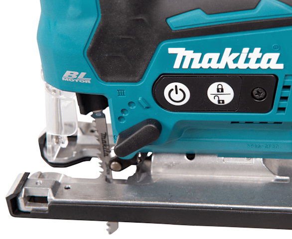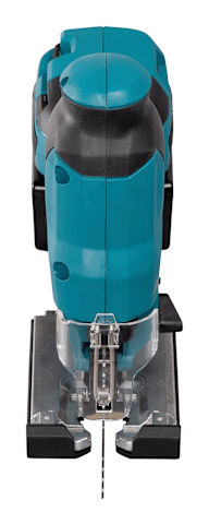 Leistungsfähige Akku-Pendelhubstichsäge mit dimmbarer LED-Beleuchtung und werkzeuglosem Sägeblattwechsel.