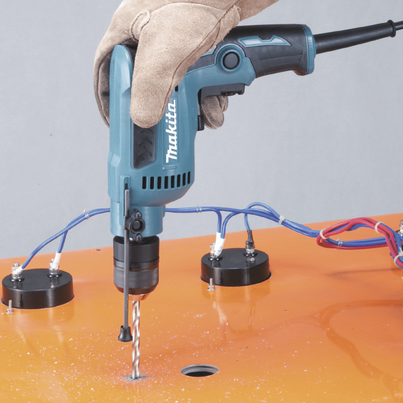 Kompakte 370 W Hochgeschwindigkeitsbohrmaschine. Das Gerät hat eine variable Drehzahl zwischen 0 und 4.200 min-1 und ist ideal für Klimaanlagenmonteure zum Bohren kleiner Lochdurchmesser z. B. für Blindnieten. Mit Schnellspannbohrfutter mit einer Spannweite von 0,8 bis 6,5 mm.