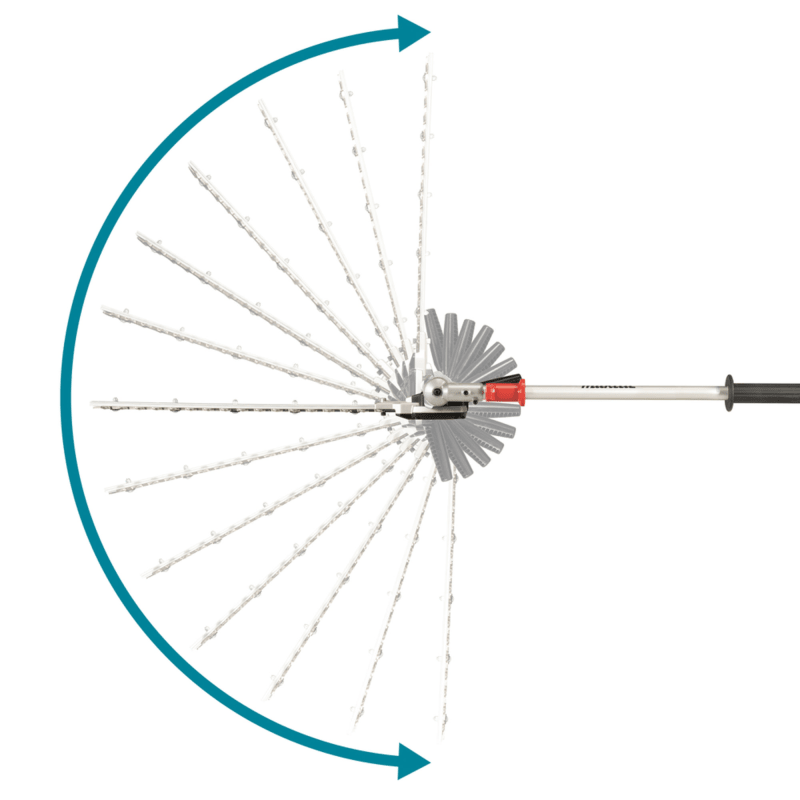 Ermöglicht das Schneiden von hohen Hecken. Der Messerbalken lässt sich in 13 Stufen verstellen, 90° nach oben und unten.