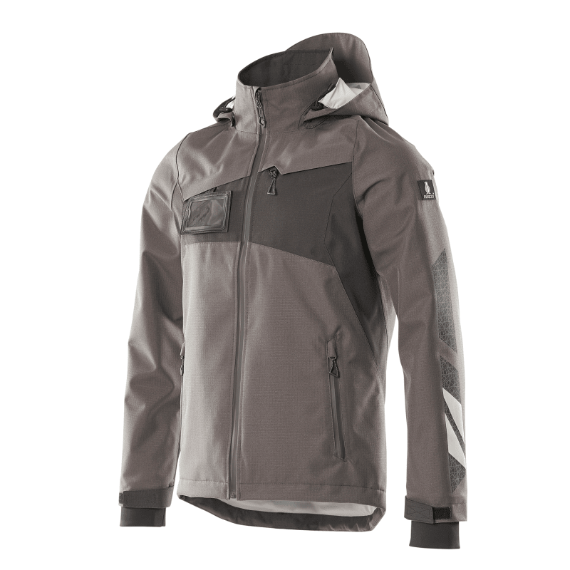 Atmungsaktiv, wind- und wasserdicht. Nähte sind verklebt. Kapuze ist abnehmbar, gefüttert und mit verstellbaren Elastikschnüren versehen. Verschluss mit Reißverschluss und inwendiger Wetterschutzleiste. Innentasche mit Reißverschluss. ID-Kartenhalter ist abnehmbar. Brusttasche mit Reißverschluss. Vordertaschen mit Reißverschluss. Gummizug in der Unterkante, regulierbar. Ärmel mit CORDURA®-Verstärkung. Rippenbündchen (verdeckt unter der Wetterschutzleiste) an den Handgelenken. Mit Druck und Reflexen.