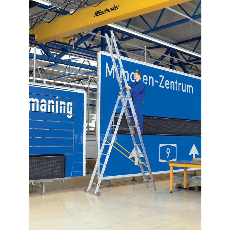 Mehrzweckleiter Skymaster X, 3-teilig • Material: Aluminium • Sprossen-Holm-Verbindung: gebördelt • Sprossen: geriffelt, 30 mm tief • Kunststoffschuhe: für rutschsicheren Stand, auswechselbar • Sprei