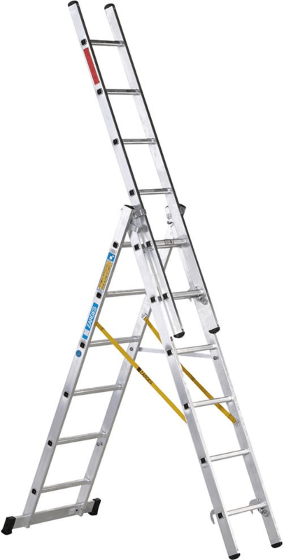 Mehrzweckleiter Skymaster X, 3-teilig • Material: Aluminium • Sprossen-Holm-Verbindung: gebördelt • Sprossen: geriffelt, 30 mm tief • Kunststoffschuhe: für rutschsicheren Stand, auswechselbar • Spreizsicherung: durch Perlongurt mit Befestigungslasche • Abhebesicherung und Führungsbeschläge: austauschbar • Belastung: max. 150 kg • Geprüfte Sicherheit: entspricht der Norm EN 131 professional und erfüllt die Anforderungen der TRBS 2121-2 Verkehrsweg