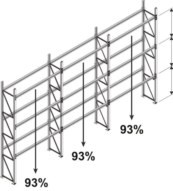 Sicherheitshinweis: Die Fachlasten gelten bei gleichmäßiger Lastverteilung. Zusätzliche Fachebenen sind bis zur max. Feldlast möglich. Die angegebenen Feldlasten gelten für Regaleinheiten mit mindestens 4 Regalfeldern, bei Einsatz von mindestens 2 Holmpaaren. Höhere Feldlasten sind durch Änderungen der Konfiguration möglich.