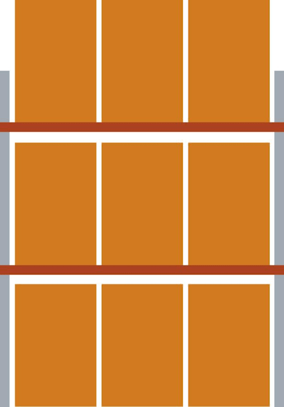 Komplettregal META MULTIPAL mit 3 Lagerebenen• Ständer: verzinkt (auf Anfrage in RAL 5010 enzianblau lieferbar) • Holme: RAL 2001 rotorange • 4-Haken-Agraffe: im 50-mm-Raster höhenverstellbar • Ste
