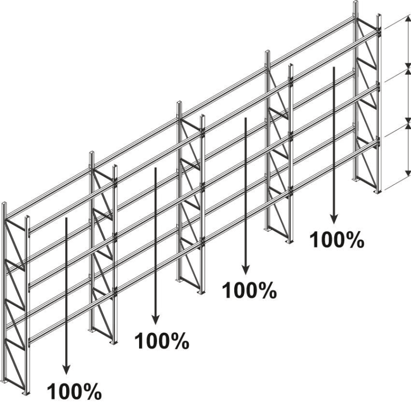 Sicherheitshinweis: Die Fachlasten gelten bei gleichmäßiger Lastverteilung. Zusätzliche Fachebenen sind bis zur max. Feldlast möglich. Die angegebenen Feldlasten gelten für Regaleinheiten mit mindestens 4 Regalfeldern, bei Einsatz von mindestens 2 Holmpaaren. Höhere Feldlasten sind durch Änderungen der Konfiguration möglich.