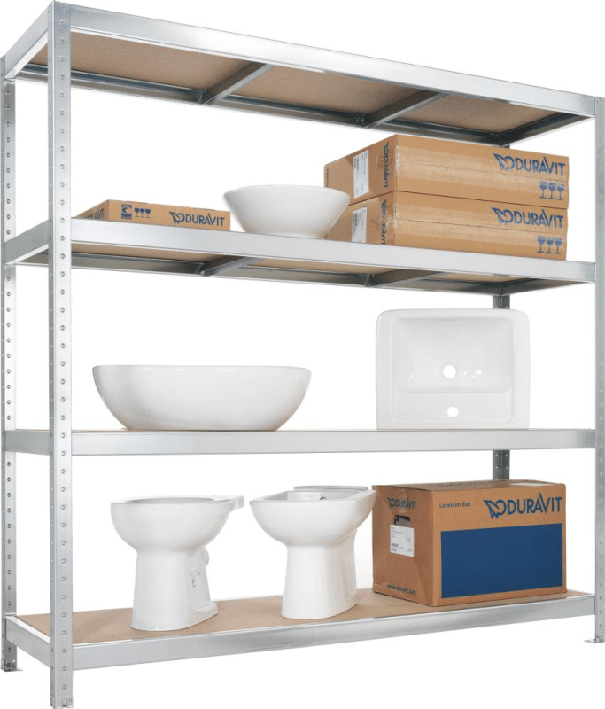 Weitspannregal META SPEED-RACK, mit Spanplatte• Oberfläche: sendzimirverzinkt • Anzahl/Typ Fachböden: 4 x Spanplatten • Raster-Höhenverstellung: 50 mm • Aussteifung: Stufenholme • Schnelle Montage