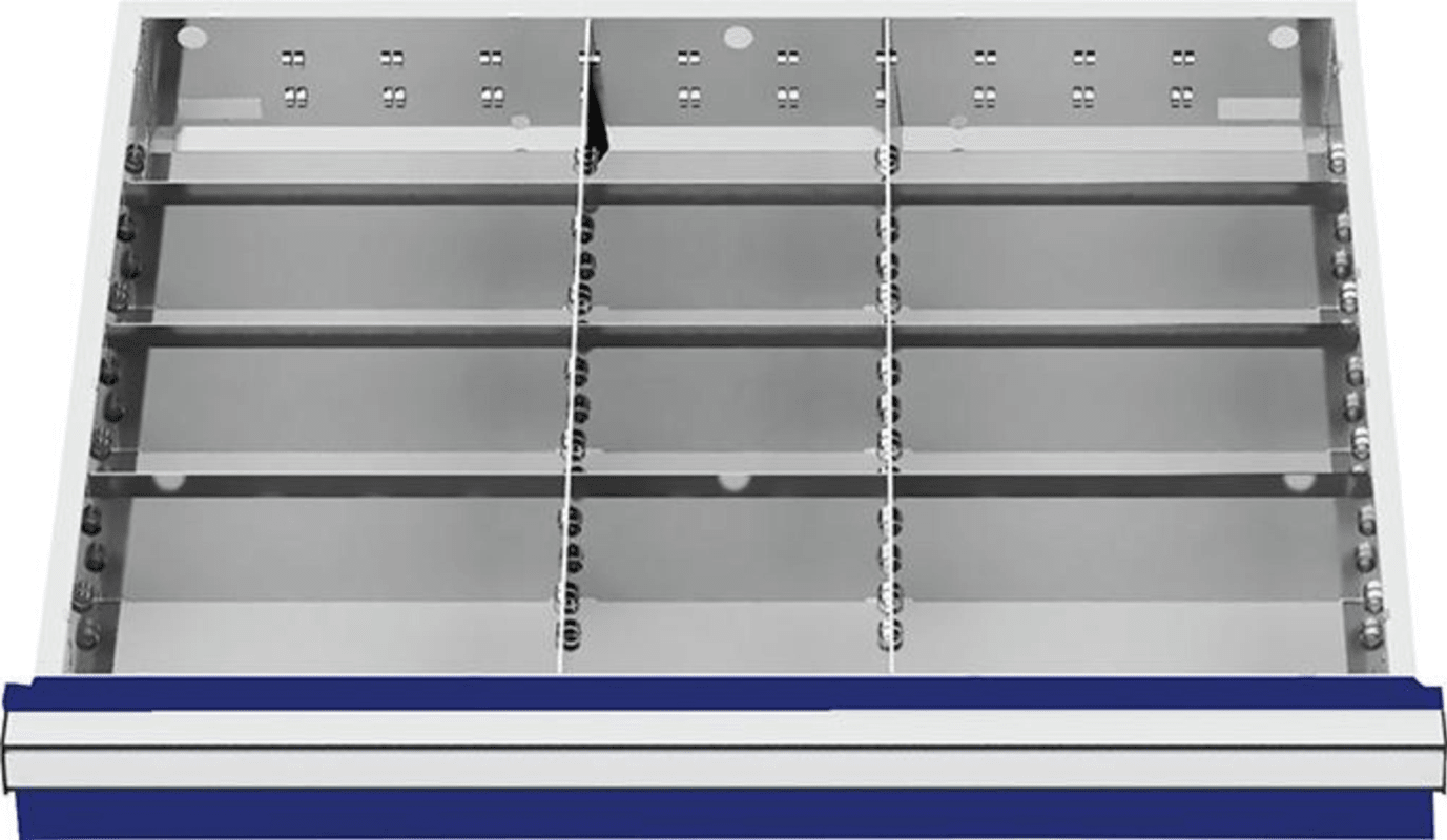 Metalleinteilung für Schubladen-Innenmaß 500 x 450 mm, 12 Fächer • Individuell nach Kundenwunsch im Raster von 50 mm einteilbar, beginnend ab 75 mm • 12 Fächer, 2 Mittelfachschienen, 6 Trennwände 175