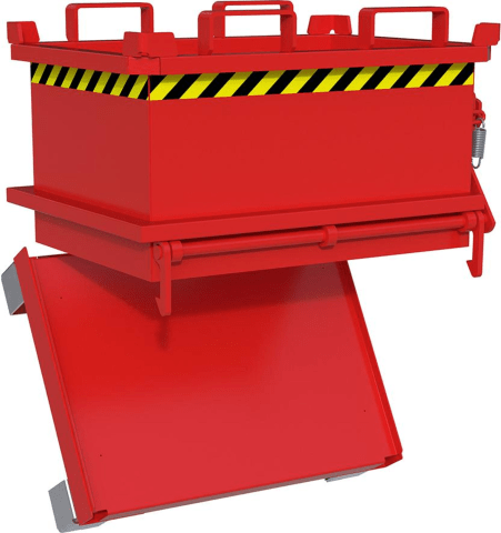 Mini-Klappbodenbehälter Typ MSB • Behälter: robuste Stahlkonstruktion • 3-fach stapelbar • Unterfahrhöhe: 100 mm (mit Gabelhubwagen transportierbar) • Bodenklappe: schließt beim Aufsetzen selbsttätig