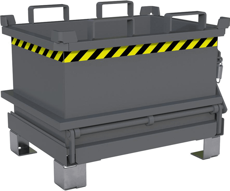 Mini-Klappbodenbehälter Typ MSB • Behälter: robuste Stahlkonstruktion • 3-fach stapelbar • Unterfahrhöhe: 100 mm (mit Gabelhubwagen transportierbar) • Bodenklappe: schließt beim Aufsetzen selbsttätig