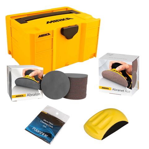 1 Pack Abranet Ace Ø 150 mm Grip P800 (50Stk./Pack), 1 Pack Abralon Ø 150 mm Grip K 3000 (20Stk./Pack), 1 x Handblock für Ø 150 mm