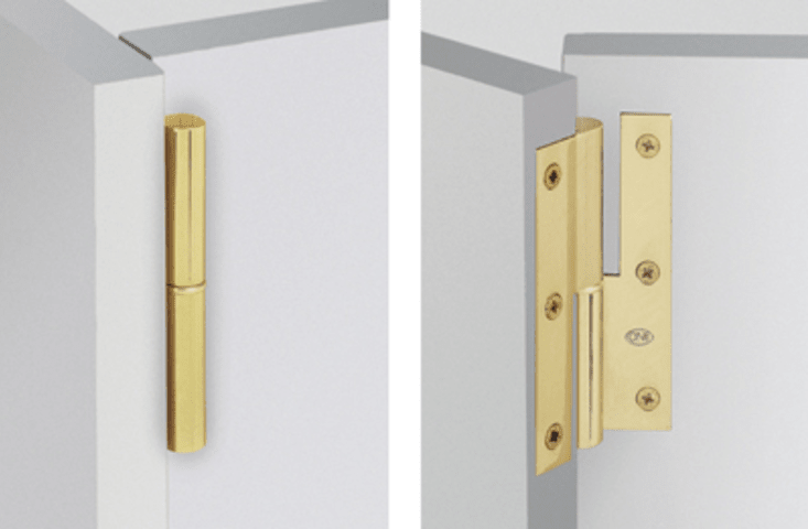 Möbelband für zurückliegende Türen Messing-Ausführung Rollendurchmesser 11 mm Lappenstärke 2 mm Aus Profilmaterial, gebohrt und gefräst, mit Stahlstift und Zwischenring.