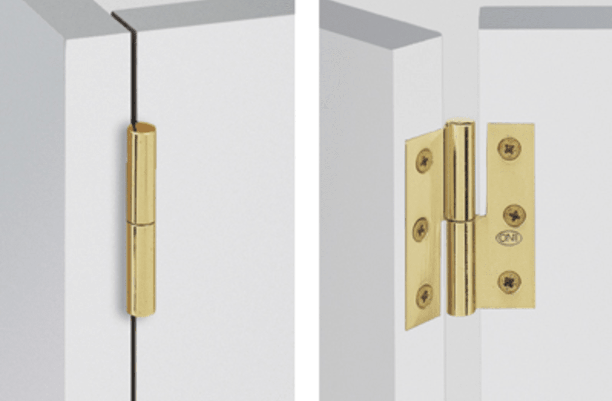 Möbelband für stumpf einliegende TürenMessing-AusführungRollendurchmesser 8 mm, Lappenstärke 1,7 mmAus Profilmaterial, gebohrt und gefräst,mit Stahlstift und angefrästen Linsenköpfen,ohne Zwischenring