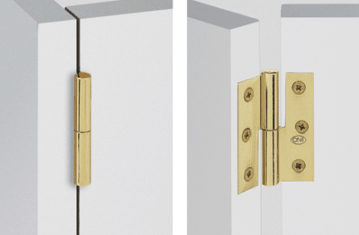 Möbelband für stumpf einliegende TürenMessing-AusführungRollendurchmesser 8 mm, Lappenstärke 1,7 mmAus Profilmaterial, gebohrt und gefräst,mit Stahlstift und angefrästen Linsenköpfen,ohne Zwischenring