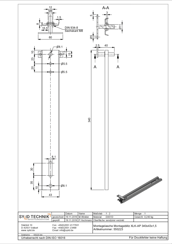 Montageblitz XL, mit höhenverstellbarer Anschraubplatte, für die auskragende Befestigung von Bauelementen bis 200 mm in der Dämmebene. Mit 8,1 mm Schraubloch. Verwendbar für die untere und seitliche Befestigung, sendzimir verzinkt, links/rechts verwendbar. Die Tragkraft ist abhängig von der Auskragung.