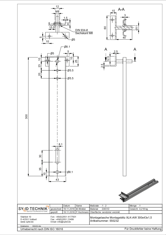 Montageblitz XL, mit höhenverstellbarem Anschraubwinkel, für die auskragende Befestigung von Bauelementen bis 200 mm in der Dämmebene. Mit 8,1 mm Schraubloch. Verwendbar für die untere und seitliche Befestigung, sendzimir verzinkt, links/rechts verwendbar. Die Tragkraft ist abhängig von der Auskragung. Maximale Last 166 kg, bei 30 mm Lasteintragung - minimale Last 16 kg bei 150 mm Lasteintragung.