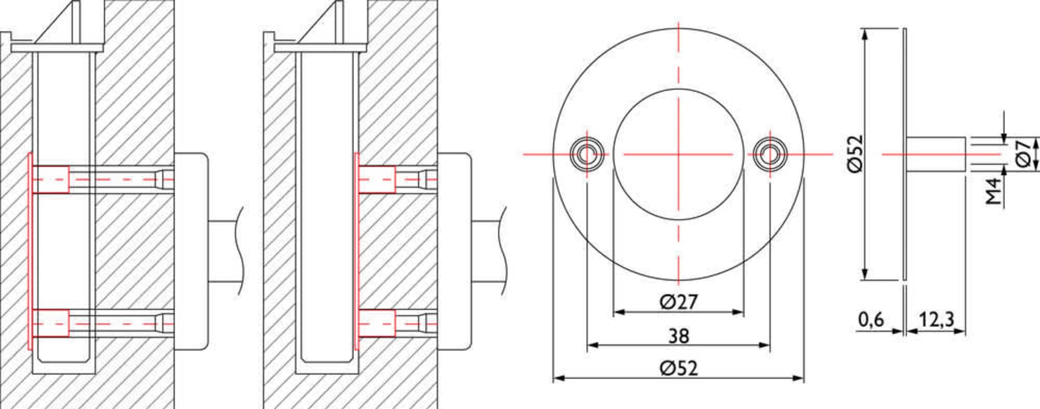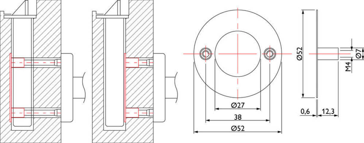 Montageplatte für Rosetten - Halbgarnituren, Dummy mit M4 Gewindenocken, Stahlplatte verzinkt 0,5 mm stark, Stahl verzinkt