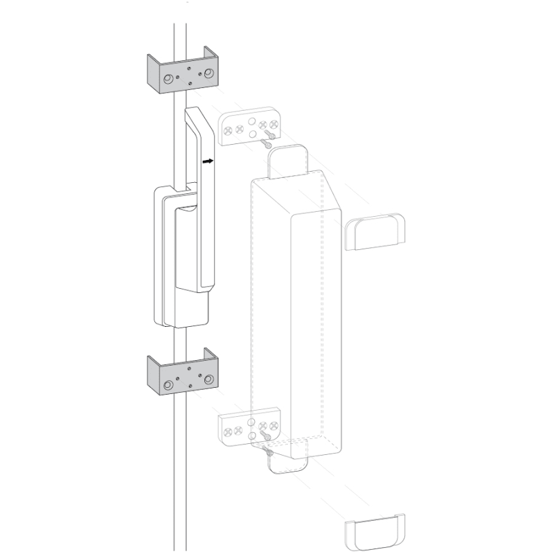 Montagewinkel zur Befestigung der Fluchtweghaube D2 / E / F bei Türen mit auftragenden Schubstangen, inkl. Befestigungsmaterial, in grün (RAL 6029).
