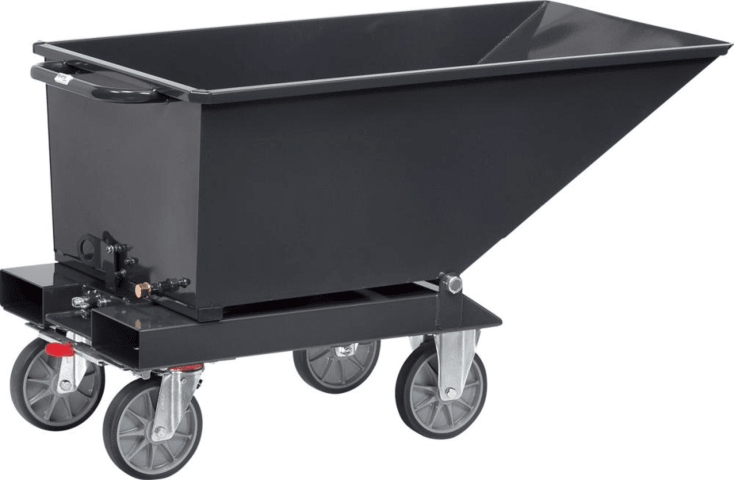 Muldenkipper, mit Ablasshahn und Sieb • Behälter aus 2 mm Stahlblech, öldicht verschweißt • Rand oben zweimal umgekantet, Schüttkante doppelt umgelegt • Untergestell aus 3 mm starken Kantprofilen mit integrierten Staplertaschen • Geeignet zum Befördern von Schüttgut, auch im Staplerbetrieb • Ablasshahn mit Sieb zum Trennen von Flüssigkeiten und Feststoffen • Kippbar gelagerte Mulde • Mit Trittblech und Kippsicherung, Rohrschiebegriff • Kippvorgang wird manuell ausgelöst • 2 Lenk- und 2 Bockrollen, TOTALSTOP-Zentralbremssystem, serienmäßig an den Lenkrollen, gemäß der Europäischen Norm EN 1757-3 (Sicherheit von Plattformwagen) • Oberfläche pulverbeschichtet