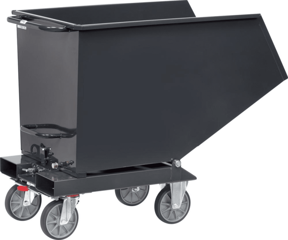 Muldenkipper, mit Ablasshahn und Sieb • Behälter aus 2 mm Stahlblech, öldicht verschweißt • Rand oben zweimal umgekantet, Schüttkante doppelt umgelegt • Untergestell aus 3 mm starken Kantprofilen mit integrierten Staplertaschen • Geeignet zum Befördern von Schüttgut, auch im Staplerbetrieb • Ablasshahn mit Sieb zum Trennen von Flüssigkeiten und Feststoffen • Kippbar gelagerte Mulde • Mit Trittblech und Kippsicherung, Rohrschiebegriff • Kippvorgang wird manuell ausgelöst • 2 Lenk- und 2 Bockrollen, TOTALSTOP-Zentralbremssystem, serienmäßig an den Lenkrollen, gemäß der Europäischen Norm EN 1757-3 (Sicherheit von Plattformwagen) • Oberfläche pulverbeschichtet