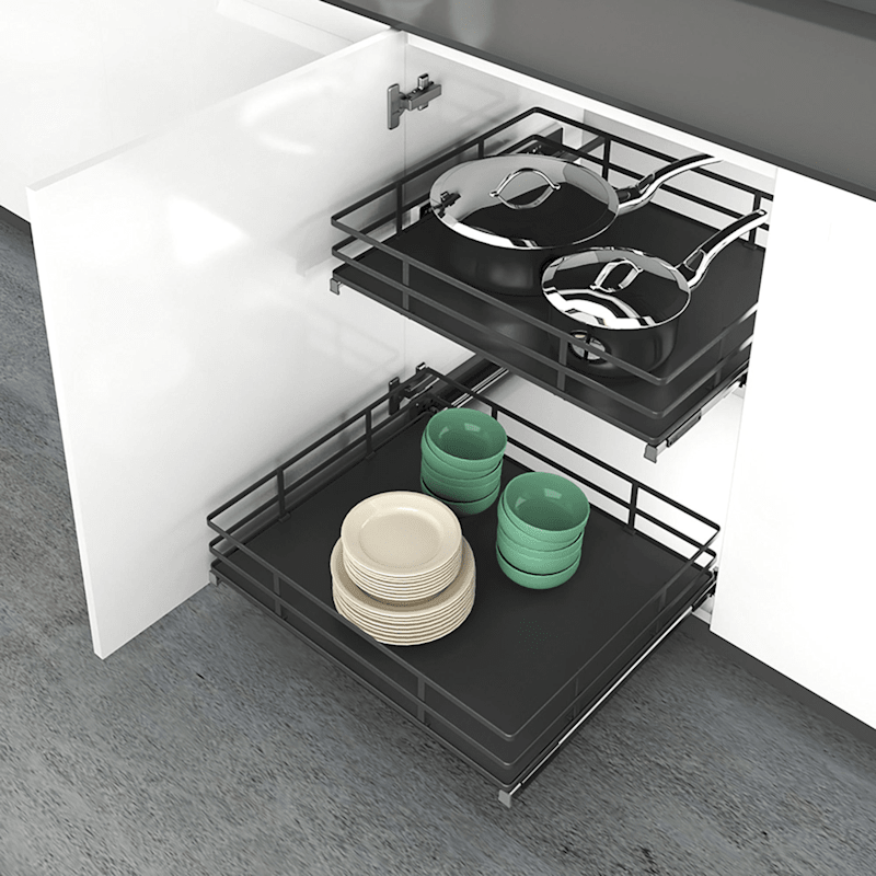 • Innenauszug zur Montage zwischen den Korpusseiten• Für Schrankbreite 450, 600 oder 900 mm• Tablar mit HDF Boden (5 mm) und Flachdraht-Reling• Passend für Quadro V6 Vollauszug, Nennlänge 470 mm (