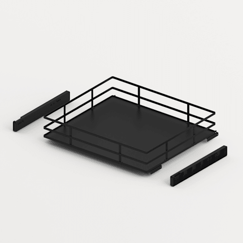 • Innenauszug zur Montage zwischen den Korpusseiten• Für Schrankbreite 450, 600 oder 900 mm• Tablar mit HDF Boden (5 mm) und Flachdraht-Reling• Passend für Quadro V6 Vollauszug, Nennlänge 470 mm (
