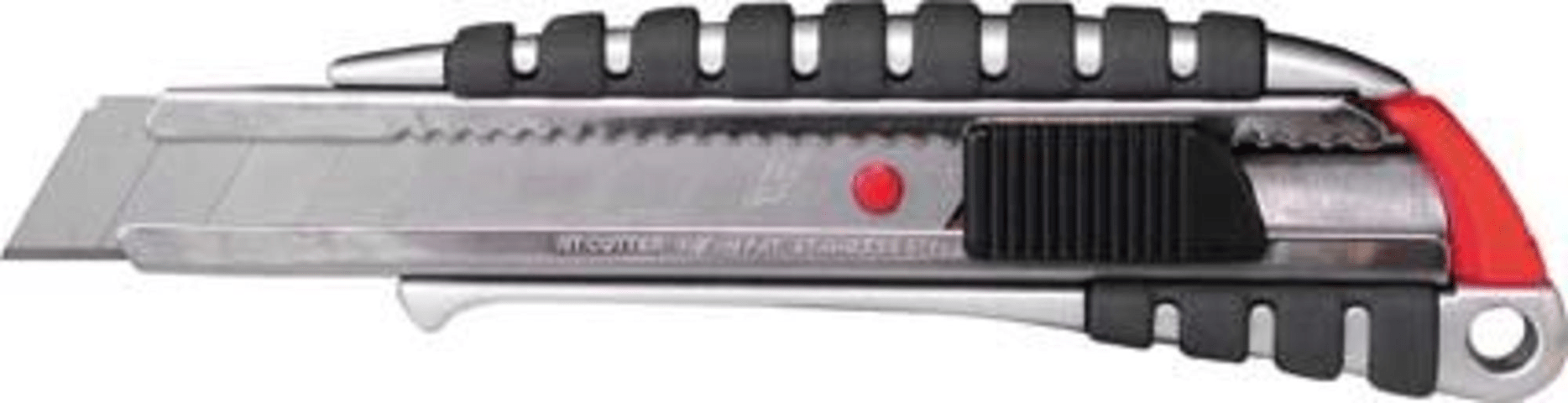 Cuttermesser, Metallgehäuse, 18 mm• Griff aus Metall • Klingenführung aus Metall • Fixierung der Klinge durch Drucktastenmechanik Lieferung: Mit 1 Abbrechklinge. Hinweis: Der Artikel unterliegt