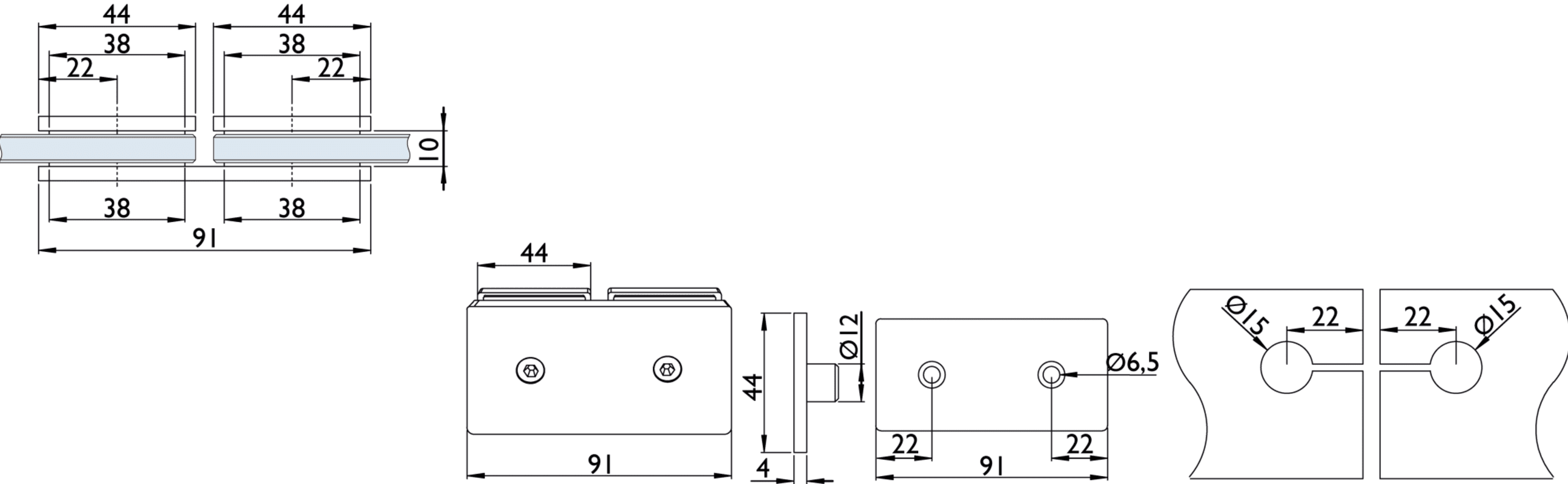 Oberlicht-Seitenteilverbinder 6707, für Glasdicken 8 - 12 mm, Oberfl. 60 (Edelstahl matt)