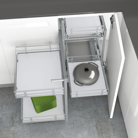 Meesenburg Artikelbezeichnung: ORTA ECKSCHRANK-DREHAUSZUG TABLARSET 400 TB500 VERCHROMT/WEISS 9381111