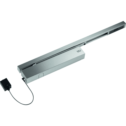 DORMA, Objekttür-Oben-Türschließer, Ausführung: mit Freilaufgleitschiene, Größe: EN 2-5, Modell: TS 99 FLR-K, DIN-Richtung: DIN Links-Rechts, Material: Aluminium, Farbton: Sonderfarbton, Oberfläche: eloxiert, Türflügelanzahl: einflügelig, Öffnungswinkel: 180 °, Norm: EN 1155, EN 1154, EN 54 Teil 7, Ergänzung: mit Schließkraft, mit Schließgeschwindigkeit, mit Endschlag, mit integriertem Netzteil, mit integriertem Rauchmelder, Befestigungsart: aufliegend, Montageart: Türblattmontage Bandseite, Schließerbreite: 413 mm, Schließerhöhe: 71 mm, Schließertiefe: 52 mm, Türbreite max.: 1250 mm, Eingangsspannung: 230 V, Stromart Eingangsspannung: AC, Betriebsspannung: 24 V, Stromart Betriebsspannung: DC, Leistungsaufnahme: 14,8 W, Schutzart: IP 20, Funktion: Freilauffunktion, Türart: Drehflügeltür, Feuerschutztür, Rauchschutztür, Türausprägung: Türe gefälzt, Türe stumpf