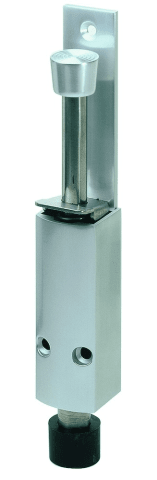 KWS Türfeststeller 1223; Ausführung: mit Konterfeder,mit Tretbolzen,mit Gummistopfen,mit Klemmplatte; Material: Aluminium; Hub: 60mm; Material Tretbolzen: Edelstahl; Einsatzbereich: Objekttür; Basis: