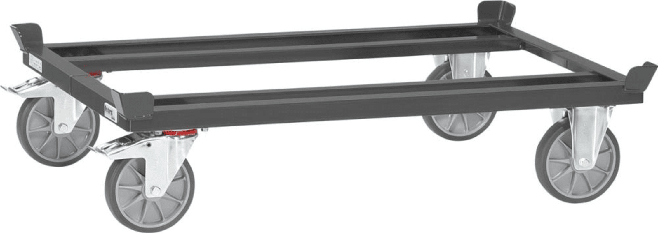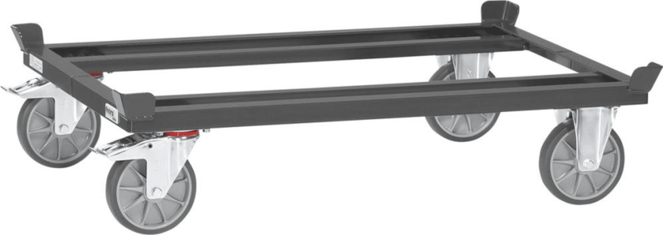 Fahrgestell für Flach-Paletten und Gitterboxen, TPE-Bereifung • Winkelstahl-Schweißkonstruktion: pulverbeschichtet • Rollen: 2 Bock-, und 2 Lenkrollen mit Feststeller gemäß der Europäischen Norm EN 1
