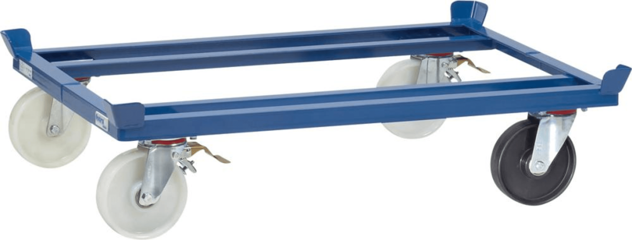 Paletten-Fahrgestelle für Routenzüge, 1 elektrisch Leitfähige Rolle • Robuste Winkelstahl-Schweißkonstruktion: mit Fangecken, pulverbeschichtet in RAL 5007 brillantblau • 3 Lenkrollen mit Polyamid-Rädern 200 x 50 mm weiß, Naben mit Präzisions-Kugellager • 1 Rolle elektrisch leitfähig, Radkörper Polypropylen schwarz, Nabe mit Präzisions-Kugellager • 2 Lenkrollen mit Totalfeststeller im Vorlauf, diagonal angeordnet • Unterfahrhöhe 235 mm Hinweis: Schlepper müssen über Frontlenkung und Routenzugdeichsel verfügen.
