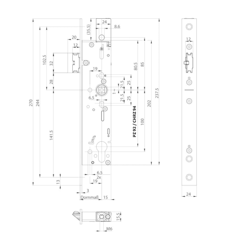 BKS Panik-Einsteckschloss B-19010; Produkttyp: Panik-Einsteckschloss; Produkttyp (Hersteller): Selbstverriegelndes Panikschloss; Ausführung: mit Obenverriegelung; Verriegelung: selbstverriegelnd (automatisch); Entriegelung: manuell; Drückernuss: geteilte Nuss; Stulpform: Flachstulp; Material Stulp: Edelstahl; Funktion Anti Panik: Umschaltfunktion B; Ausführung Riegel: Fallenriegel mit Auslösehebel; Schlosskasten: offen; Schlosskastenhöhe: 202 mm; Schlosskastenstärke: 15,5 mm; Norm: DIN EN 12209,DIN EN 1125,DIN EN 179; Zulassung: für Feuerschutz,für Fluchttüren,für Rauchschutz; Türart: Rohrrahmen; Türflügelanzahl: zweiflügelig; Türwerkstoff: Aluminium,Stahl; Einsatzbereich: Gangflügel; Dornmaß: 35 mm; Hinterdornmaß: 15 mm; Drückernussvierkant: 9 mm; Entfernung: 92 mm; Lochung: Profilzylinder gelocht; DIN-Richtung: DIN Links-Rechts; Stulpausführung: kantig; Stulpbreite: 24 mm; Stulplänge: 270 mm; Stulpstärke: 3 mm; Farbton Stulp: edelstahl; Oberfläche Stulp: matt; Einbautiefe Schlosskasten: 47 mm; Wechsel: ohne Wechsel