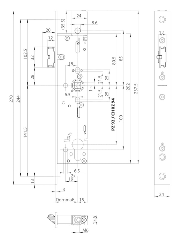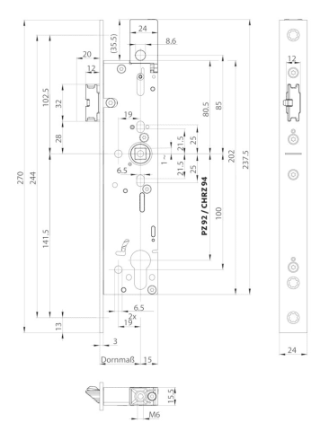 BKS Panik-Einsteckschloss B-19000; Produkttyp: Panik-Einsteckschloss; Produkttyp (Hersteller): Selbstverriegelndes Panikschloss; Ausführung: mit Obenverriegelung; Verriegelung: selbstverriegelnd (automatisch); Entriegelung: manuell; Drückernuss: geteilte Nuss; Stulpform: Flachstulp; Material Stulp: Edelstahl; Funktion Anti Panik: Umschaltfunktion B; Ausführung Riegel: Fallenriegel mit Auslösehebel; Schlosskasten: offen; Schlosskastenhöhe: 202 mm; Schlosskastenstärke: 15,5 mm; Norm: DIN EN 179,DIN EN 12209,DIN EN 1125; Zulassung: für Feuerschutz,für Fluchttüren,für Rauchschutz; Türart: Rohrrahmen; Türflügelanzahl: einflügelig; Türwerkstoff: Aluminium,Stahl; Einsatzbereich: Gangflügel; Dornmaß: 40 mm; Drückernussvierkant: 9 mm; Entfernung: 94 mm; Lochung: Schweizer Rundzylinder gelocht; DIN-Richtung: DIN Links-Rechts; Öffnungsrichtung: nach innen öffnend/nach außen öffnend; Stulpausführung: kantig; Stulpbreite: 24 mm; Stulplänge: 320 mm; Stulpstärke: 3 mm; Farbton Stulp: edelstahl; Oberfläche Stulp: matt; Zusatzfunktion-/Ausstattung: Überwachungsfunktion; Einbautiefe Schlosskasten: 52 mm; Wechsel: ohne Wechsel