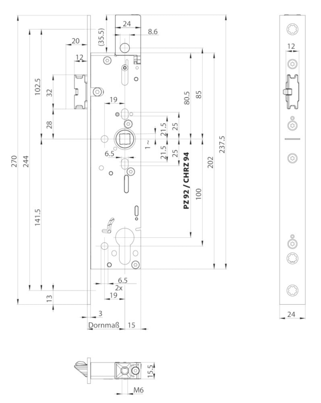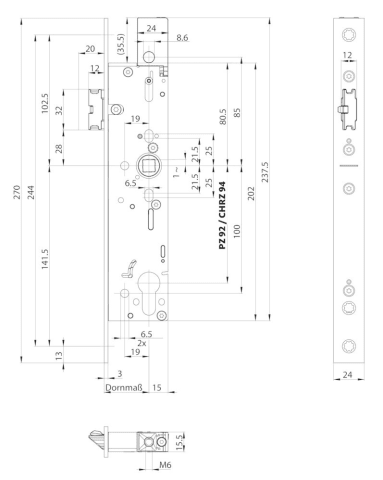 BKS Panik-Einsteckschloss B-19070; Produkttyp: Panik-Einsteckschloss; Produkttyp (Hersteller): Selbstverriegelndes Panikschloss; Ausführung: mit Obenverriegelung; Verriegelung: selbstverriegelnd (automatisch); Entriegelung: manuell; Drückernuss: einteilig; Stulpform: Flachstulp; Material Stulp: Edelstahl; Funktion Anti Panik: Wechselfunktion E; Ausführung Riegel: Fallenriegel mit Auslösehebel; Schlosskasten: offen; Schlosskastenhöhe: 202 mm; Schlosskastenstärke: 15,5 mm; Norm: DIN EN 12209,DIN EN 1125,DIN EN 179; Zulassung: für Feuerschutz,für Fluchttüren,für Rauchschutz; Türart: Rohrrahmen; Türflügelanzahl: zweiflügelig; Türwerkstoff: Aluminium,Stahl; Einsatzbereich: Gangflügel; Dornmaß: 40 mm; Hinterdornmaß: 15 mm; Drückernussvierkant: 9 mm; Entfernung: 94 mm; Lochung: Schweizer Rundzylinder gelocht; DIN-Richtung: DIN Links-Rechts; Öffnungsrichtung: nach außen öffnend; Stulpausführung: kantig; Stulpbreite: 24 mm; Stulplänge: 270 mm; Stulpstärke: 3 mm; Farbton Stulp: edelstahl; Oberfläche Stulp: matt; Einbautiefe Schlosskasten: 52 mm; Wechsel: mit Wechsel