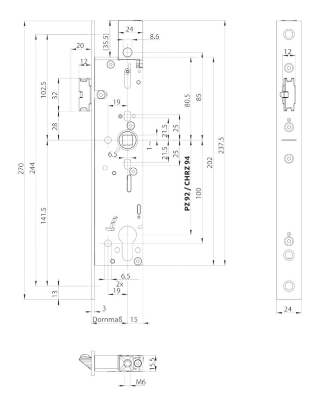 BKS Panik-Einsteckschloss B-19060; Produkttyp: Panik-Einsteckschloss; Produkttyp (Hersteller): Selbstverriegelndes Panikschloss; Ausführung: mit Obenverriegelung; Verriegelung: selbstverriegelnd (automatisch); Entriegelung: manuell; Drückernuss: einteilig; Stulpform: Flachstulp; Material Stulp: Edelstahl; Funktion Anti Panik: Wechselfunktion E; Ausführung Riegel: Fallenriegel mit Auslösehebel; Schlosskasten: offen; Schlosskastenhöhe: 202 mm; Schlosskastenstärke: 15,5 mm; Norm: DIN EN 1125,DIN EN 179,DIN EN 12209; Zulassung: für Feuerschutz,für Fluchttüren,für Rauchschutz; Türart: Rohrrahmen; Türflügelanzahl: einflügelig; Türwerkstoff: Aluminium,Stahl; Einsatzbereich: Gangflügel; Dornmaß: 40 mm; Hinterdornmaß: 15 mm; Drückernussvierkant: 9 mm; Entfernung: 94 mm; Lochung: Schweizer Rundzylinder gelocht; DIN-Richtung: DIN Links-Rechts; Öffnungsrichtung: nach außen öffnend; Stulpausführung: kantig; Stulpbreite: 24 mm; Stulplänge: 320 mm; Stulpstärke: 3 mm; Farbton Stulp: edelstahl; Oberfläche Stulp: matt; Zusatzfunktion-/Ausstattung: Überwachungsfunktion; Schlossriegel: 1 tourig; Riegelausschluss: 20 mm; Einbautiefe Schlosskasten: 52 mm; Wechsel: mit Wechsel
