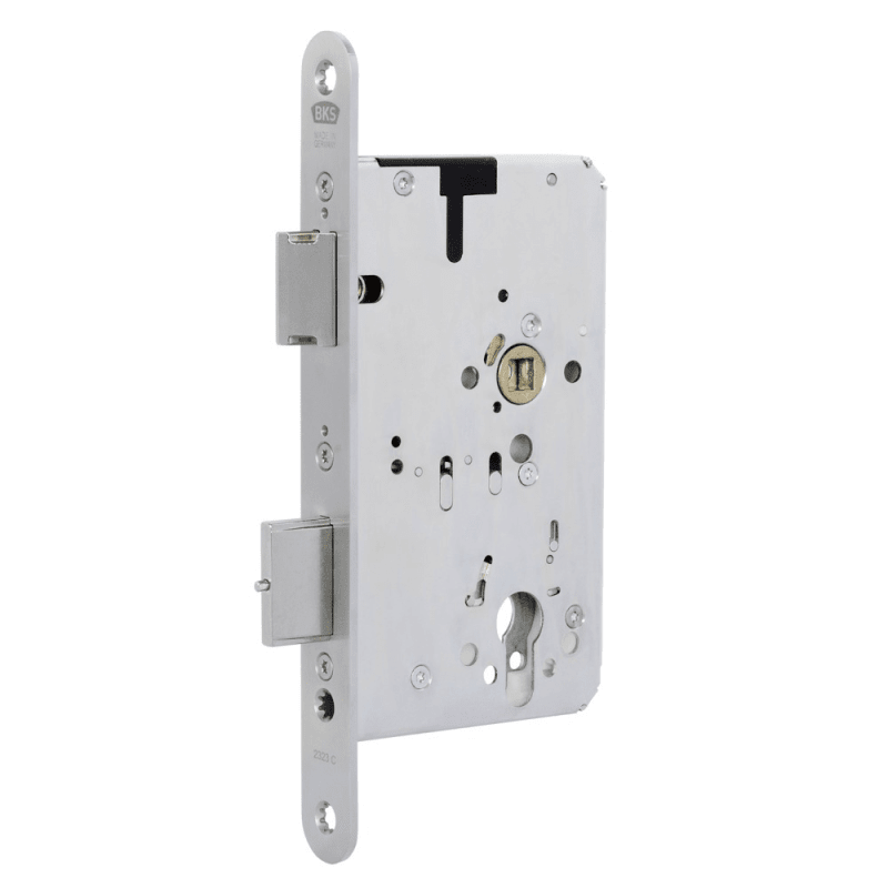 BKS Panik-Einsteckschloss B-23230; Produkttyp: Panik-Einsteckschloss; Produkttyp (Hersteller): Panikschloss; Verriegelung: manuell; Entriegelung: manuell; Drückernuss: geteilte Nuss; Stulpform: Flachs