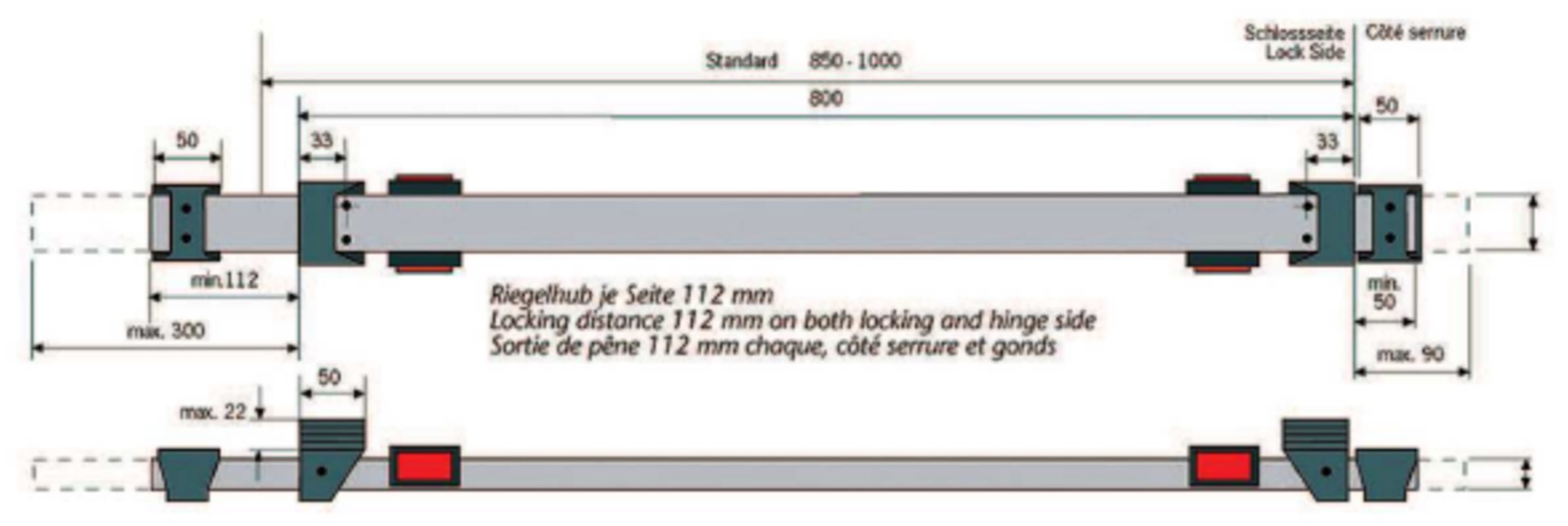 Technik und Ausstattung: Sichert die Tür über die gesamte Breite. Hohe Widerstandskräfte durch Spezialriegel. Für Türbreiten von 850-1000 mm. Schlosskörperlänge 800 mm. ABUS Level 8.