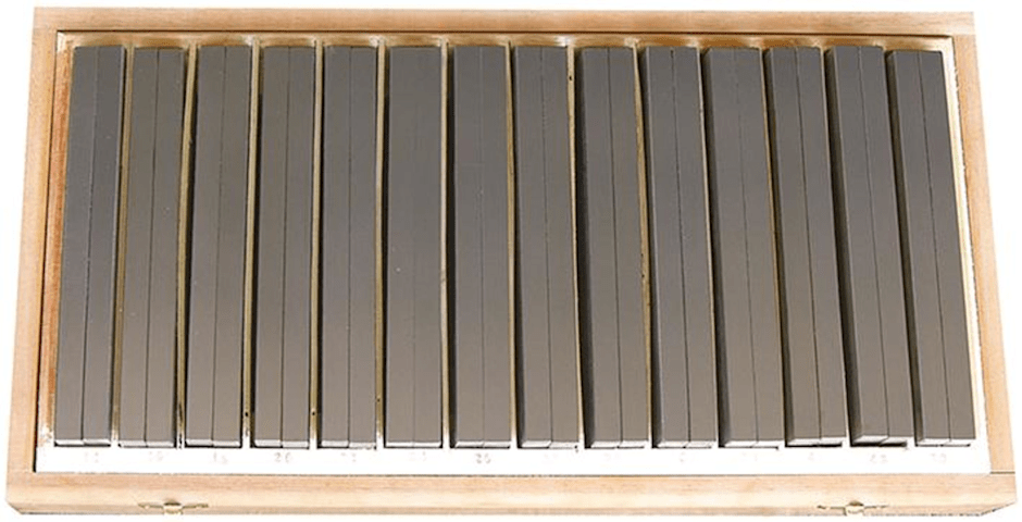 Parallelunterlagen-Satz im Holzkaste • Aus Spezialstah • Paarweise fein geschliffen und gehärte • Parallelität 0,010 m • Toleranz ± 0,01 m • Winkelgenauigkeit 0,008 mm/100 m • Härte HRC 50 ± • Werk