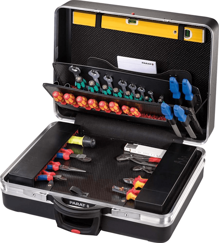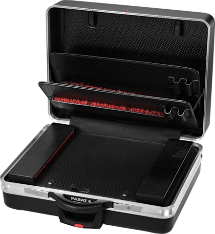Werkzeugkoffer CLASSIC• Kofferschale aus X-ABS-Kunststoff, schwarz • Verschleißfest und feuchtigkeitsbeständig • Verzinkte und arretierte Metallscharniere • Aluminium-Doppelrahmen • Stabiler 4-