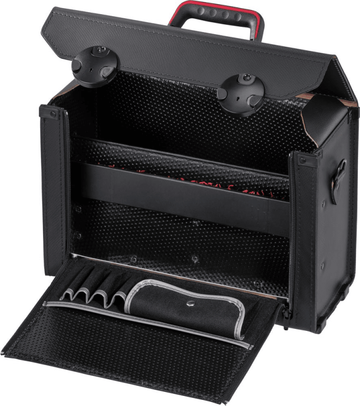 Werkzeugtasche TOP-LINE• Rindleder • Werkzeugtafel aus Con-Pearl® • Feuchtigkeits- und chemikalienbeständig • Vorderwand aufklappbar, mit 4 Separationen • Rückwand mit CP-7-Werkzeughalter Ø 26 mm